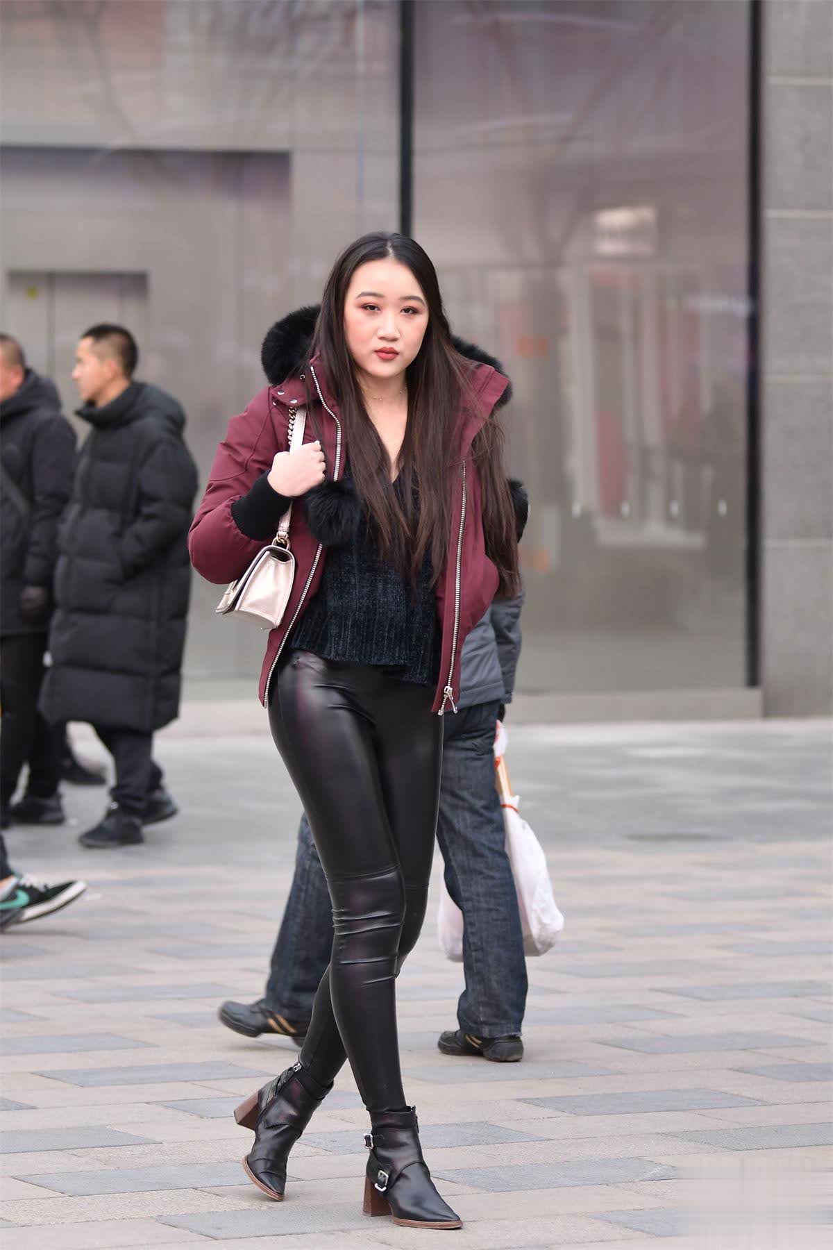 黑色紧身皮裤,6里面的粗跟黑色皮短靴,深红色短款羽绒服